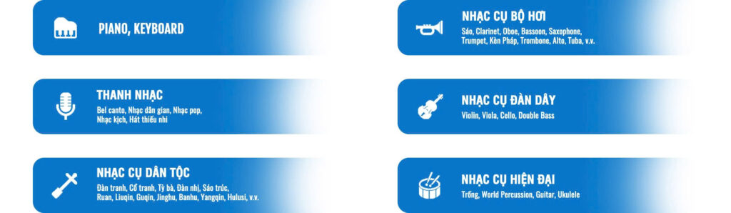 * Bao gồm: Bel canto, Nhạc dân gian, Nhạc Pop, Nhạc kịch, Hát thiếu nhi